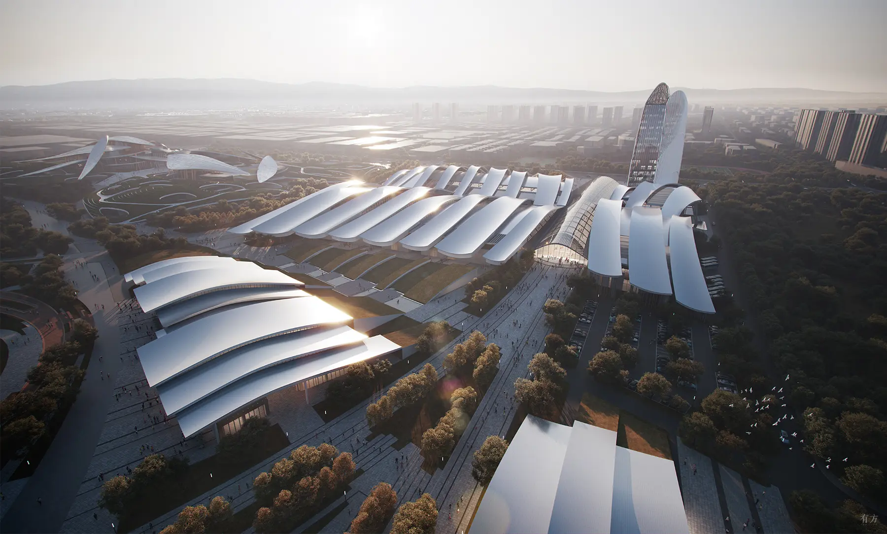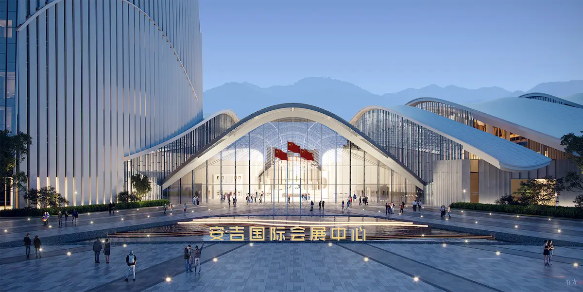 Anji International Convention & Exhibition Center is the landmark core of Anji’s “Two Mountains” Future Tech City, with a total floor area of 170,000 sqm including a 10,000 sqm exhibition hall for 500+ booths, a 5,000 sqm multifunctional hall, hotel, commercial facilities, and emergency response space. Opening in 2025, the design draws from Anji’s mountains and bamboo culture, forming the concept of “two mountains, one valley.” Bamboo-weaving imagery shapes the façade, a curved steel roof tops the main hall, and flexible partitions up to 11.3 meters support adaptable layouts. Interiors combine modern transparency with warm, elegant finishes to reflect Anji’s ecological identity.
