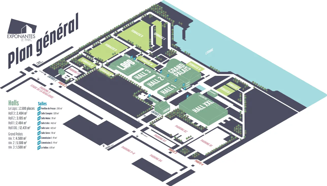 ExpoNantes – Parc des Expositions de Nantes is a major exhibition and event centre in the Beaujoire district of Nantes, France, offering approximately 38,000 m² of indoor exhibition space across six halls, 28,000 m² of outdoor exhibition space, about 12 meeting rooms, 5,000 parking spaces, and on-site dining services within 20 hectares of landscaped grounds by the Erdre River. The venue hosts more than 85 annual events attracting hundreds of thousands of visitors and thousands of exhibitors and is easily accessible by Tram Line 1, local buses, train connections from Nantes station, and direct road access, with nearby hotels, restaurants, and business amenities readily available.