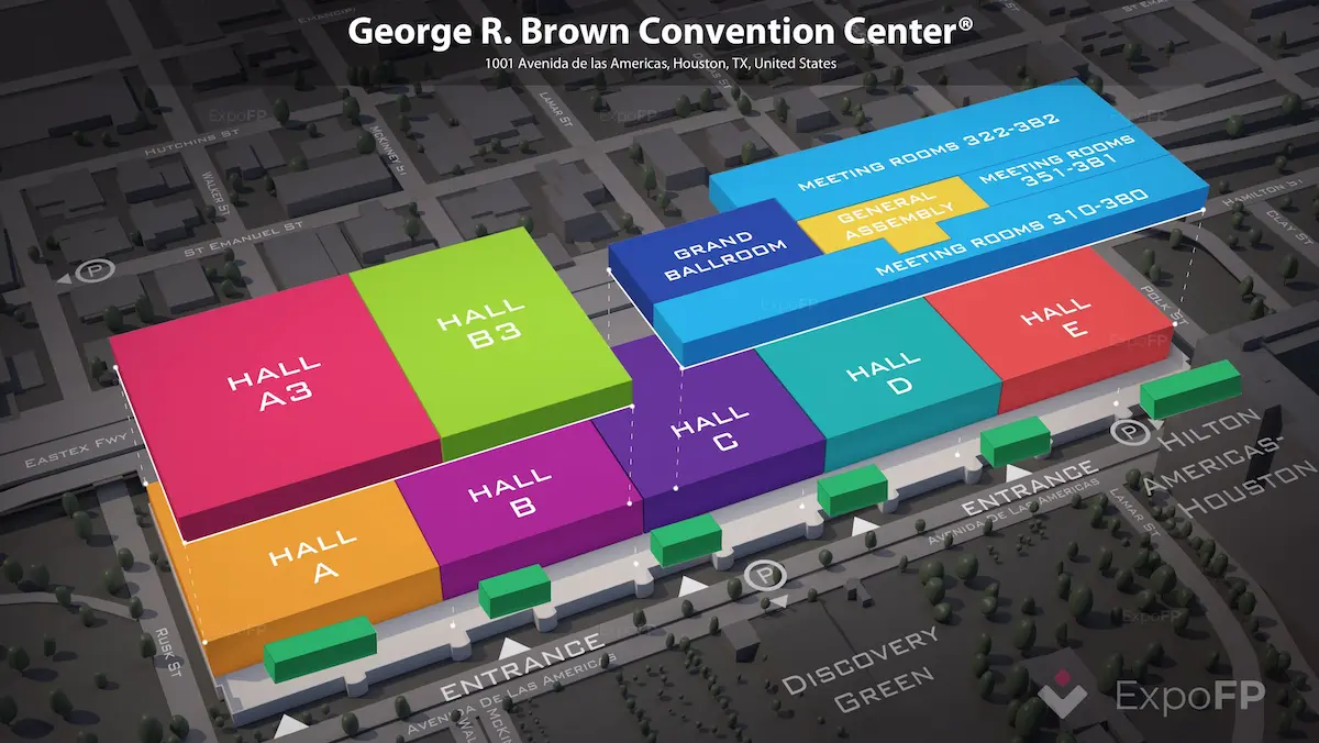 The George R. Brown Convention Center is a major convention and exhibition venue located at 1001 Avenida de las Americas, Downtown Houston, Texas, USA, adjacent to Discovery Green park and the Toyota Center. Opened in 1987, it spans approximately 1,800,000 sq ft (167,225 m²), with over 700,000 sq ft (65,032 m²) of indoor exhibit space across seven halls, around 100 meeting rooms, four conference rooms, and a 31,590 sq ft (2,933 m²) grand ballroom. The venue features a 3,600‑seat assembly theater, outdoor Avenida Plaza of 99,000 sq ft (9,197 m²), multiple restaurants and cafés, and nearby parking totaling 10,000+ spaces. Accessible via the Convention District METRORail station, bus routes, taxi, and rideshare, the center is connected to hotels like Hilton Americas‑Houston and surrounded by additional hotels, shopping, and business centers. Known for hosting large-scale conventions, trade shows, and cultural events, it is undergoing a $2 billion expansion to increase exhibition space and amenities, cementing its status as one of the largest and most versatile convention centers in the United States.