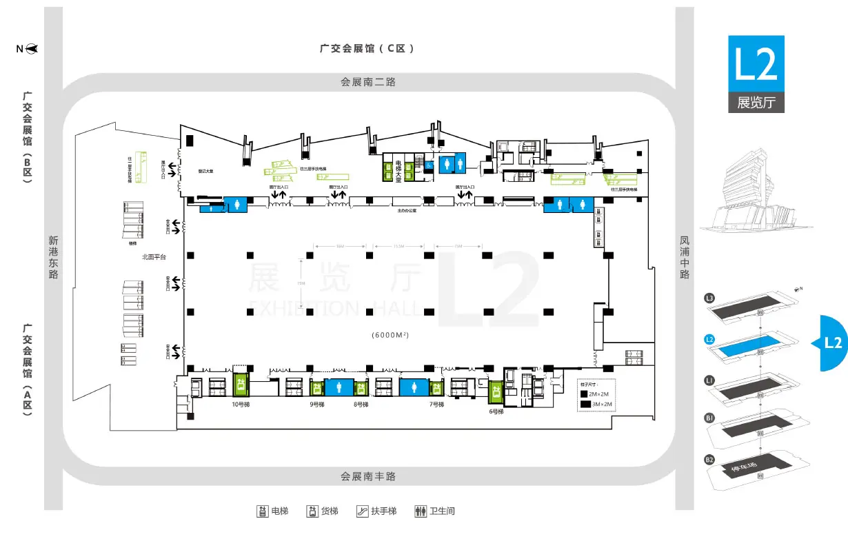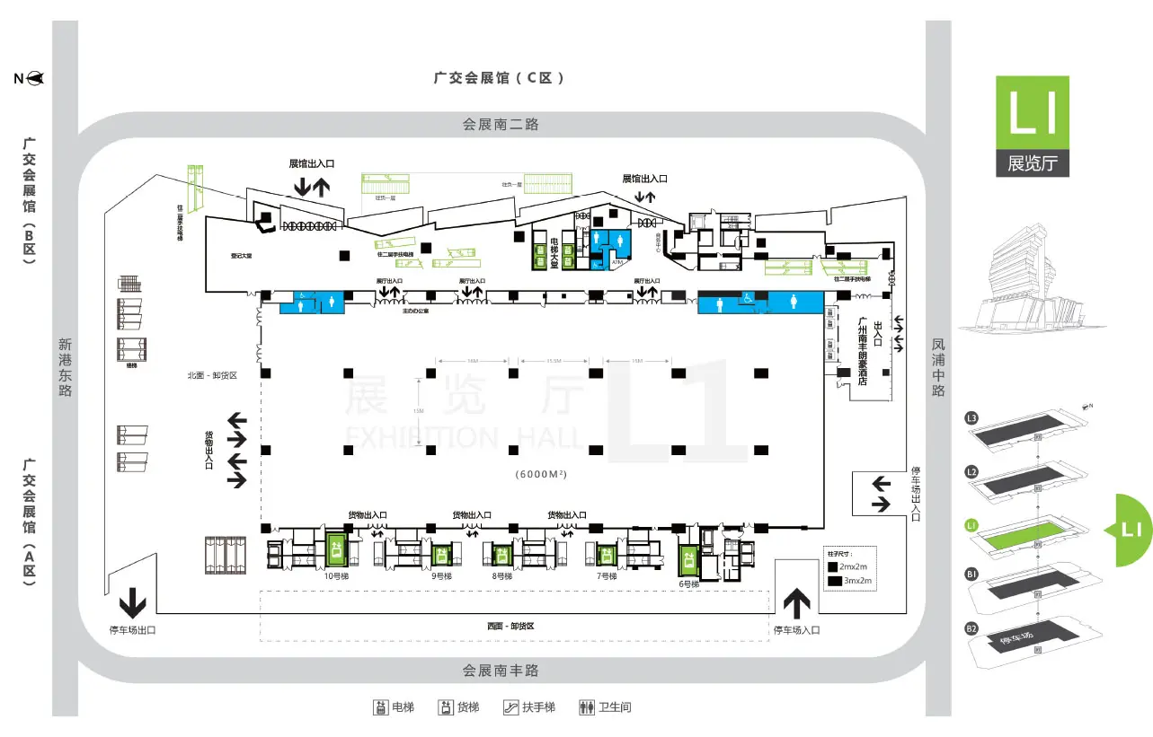 Haizhu International Convention and Exhibition Center (formerly Nanfeng International Convention and Exhibition Center) offers three exhibition halls including L1 and L2 halls of 6,000 sqm each with 8 m clearance, 18 m × 17 m column grid, and 1.5 ton/sqm floor loading, and a 5,000 sqm column-free L3 multi-functional hall with 11 m clearance and the same load capacity. The venue provides an approximately 1,953 sqm unloading area, a freight entrance (7 m wide, 3.5 m high), two 5-ton cargo lifts (3.4 m × 3 m × 6 m) and three 5-ton cargo lifts (2.8 m × 2.4 m × 3.6 m). Facilities also include a VIP room for 12–20 persons on the first floor, two 20-person meeting rooms on the second floor, and multiple organizer offices across B1, 1F, and 2F.