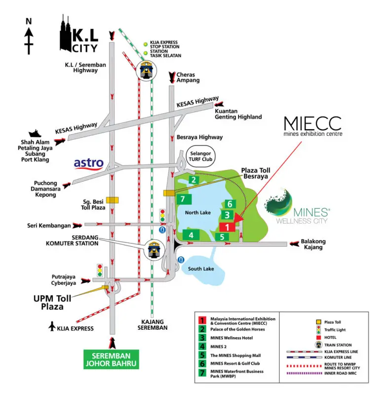 Mines International Exhibition & Convention Centre (MIECC), located at Jalan Dulang, Mines Wellness City, Seri Kembangan, Selangor, is a premier exhibition and convention venue in Malaysia. It offers around 16,722 m² of column-free indoor exhibition space, multiple meeting and conference rooms, banquet facilities for over 8,000 guests, and approximately 1,500 parking bays. The centre is connected to The Mines Shopping Mall and nearby hotels such as Palace of the Golden Horses and Mines Wellness Hotel & Spa, and is accessible via KTM Serdang Komuter, MRT/LRT, buses, and major highways. MIECC is known for hosting large-scale trade shows, conventions, concerts, and corporate events, combining modern infrastructure with convenient amenities.