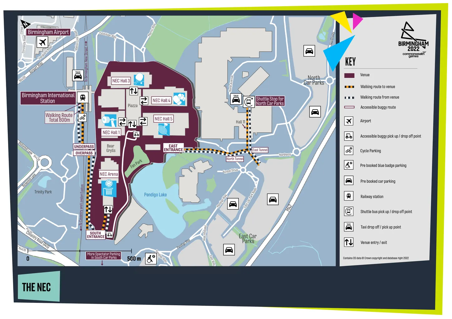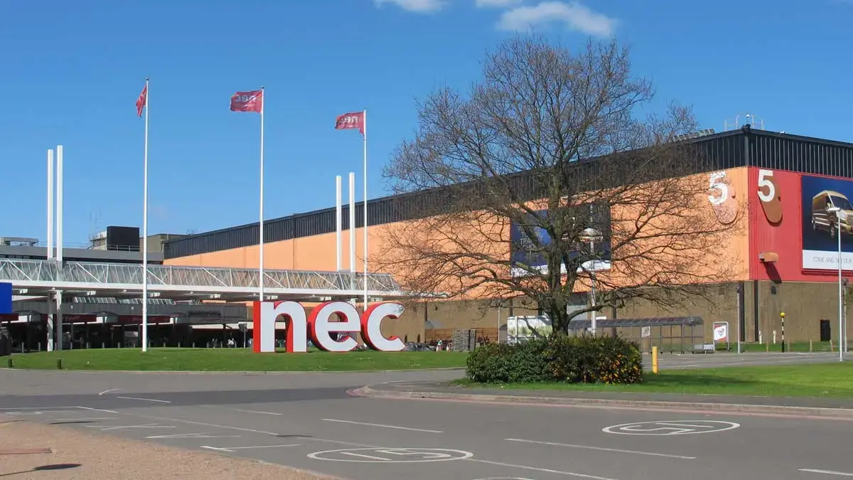 National Exhibition Centre (NEC Birmingham) is a multi-purpose exhibition and conference venue located in Marston Green, Solihull, near Birmingham, England, adjacent to Birmingham Airport and Birmingham International railway station. The venue offers approximately 190,000 sqm of indoor exhibition space across 18 interconnected halls, around 32 conference and meeting suites, and more than 16,500 parking spaces. Hosting about 500 events annually and welcoming over 2 million visitors, it is known for major UK trade shows and consumer exhibitions. The NEC is directly accessible by train via Birmingham International station (connected by a covered walkway), by road via the M42 motorway, and by air through Birmingham Airport with an Air-Rail Link. The surrounding campus includes multiple on-site hotels such as Hilton Birmingham Metropole and Genting Hotel, as well as Resorts World Birmingham with retail, dining and entertainment facilities, while Birmingham city centre is approximately 10 minutes away by train.
