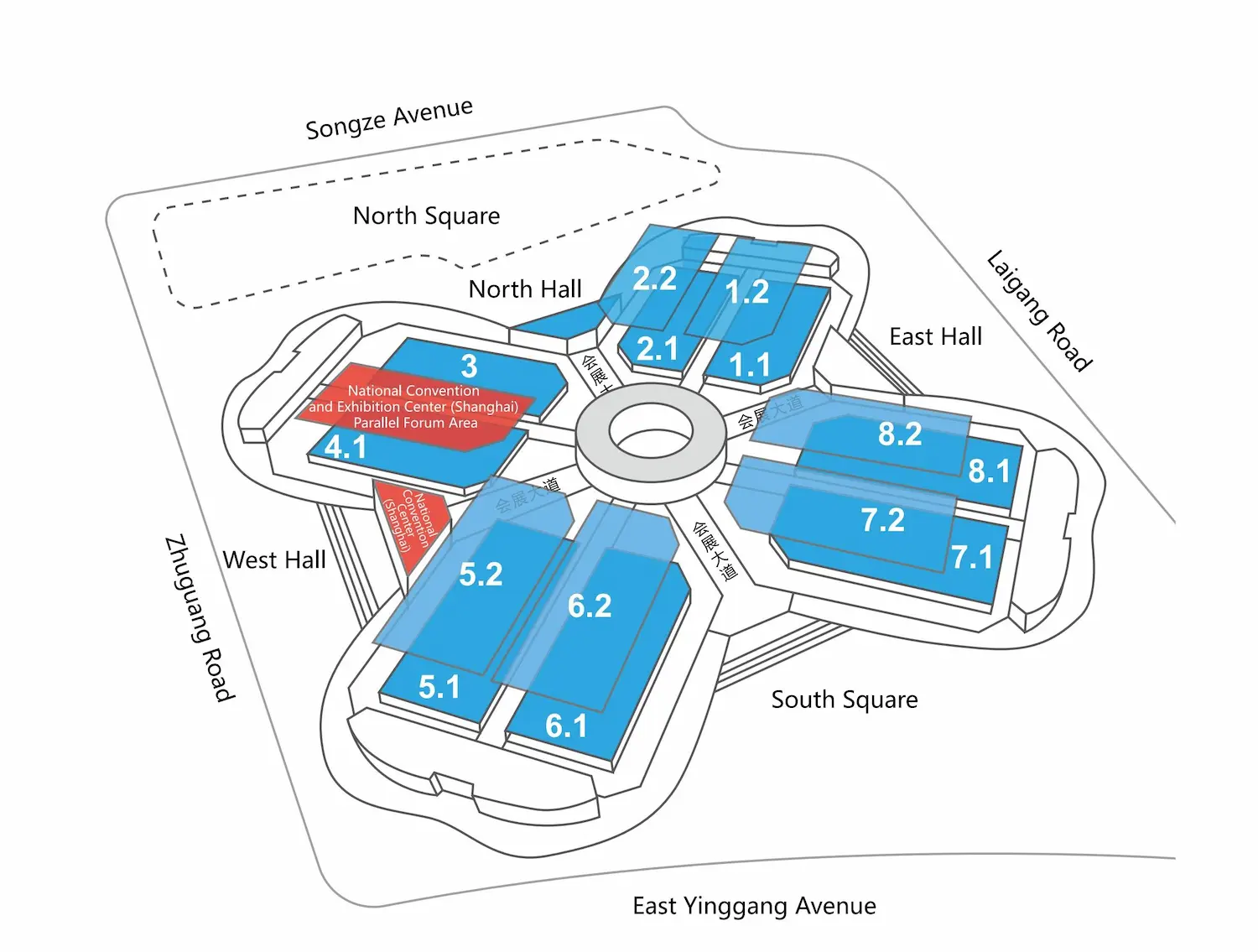 The Shanghai National Exhibition and Convention Center, jointly developed by China’s Ministry of Commerce and the Shanghai Municipal Government, is the world’s largest exhibition complex, spanning over 1.5 million sqm. Opened in 2011 with a 16 billion RMB investment, it integrates exhibition, conference, commercial, office, and hotel facilities. Its iconic clover-shaped design reflects Chinese cultural elements. The venue offers 600,000 sqm of exhibition space across 17 halls and was certified as China’s largest green exhibition building in 2020. Located in the Hongqiao Business District, it is directly connected to Hongqiao Railway Station, Airport, and Metro Line 2.