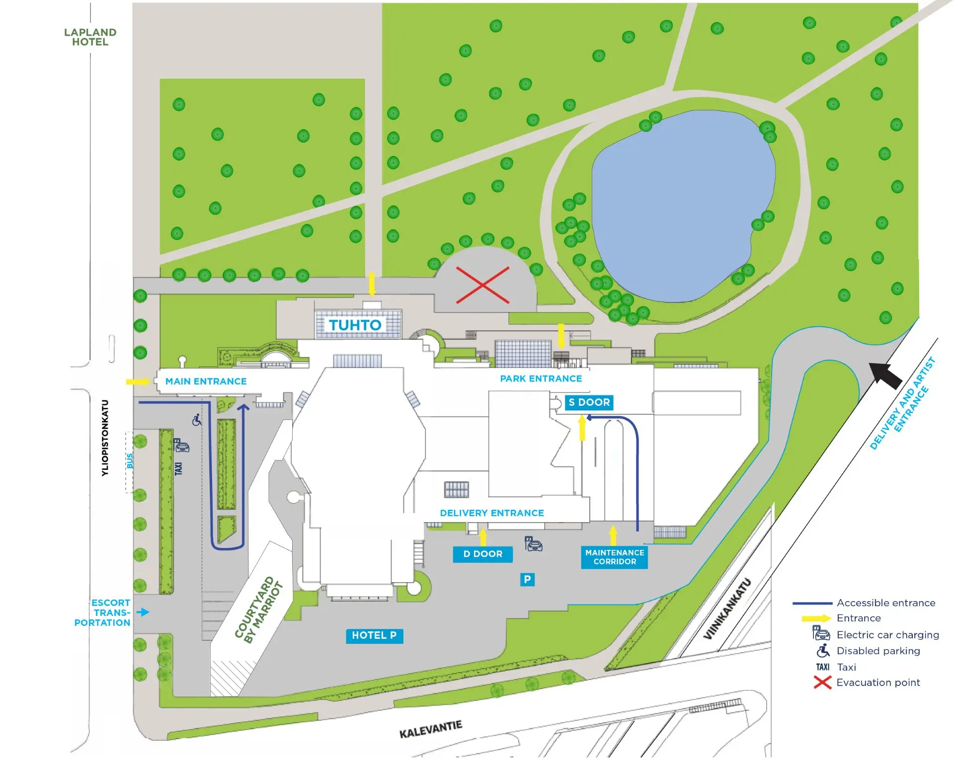 Tampere Hall is the largest congress and concert centre in the Nordic countries, located in central Tampere beside Sorsapuisto Park, approximately 500 meters from Tampere Railway Station and the main bus station. The multi-purpose venue hosts conferences, exhibitions, concerts, and cultural events, and is home to the Tampere Philharmonic Orchestra and the Moomin Museum. The facility includes a main auditorium seating up to 1,900 guests, a secondary auditorium for around 500 attendees, approximately 20 meeting and event rooms, multiple restaurants and cafés, and on-site parking with additional large public parking nearby. It is within walking distance of several hotels, including Courtyard by Marriott Tampere City, as well as shopping areas and business centers. Known for its acoustics, sustainability initiatives, and versatile event infrastructure, Tampere Hall hosts hundreds of events annually and serves as a key venue for international congresses and trade exhibitions in Finland.