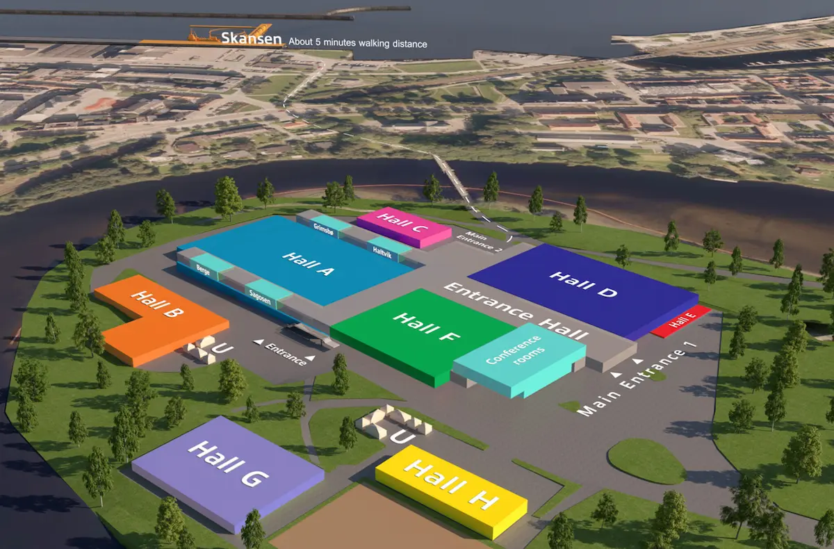 Trondheim Spektrum is a multi-purpose indoor arena and exhibition venue located at Klostergata 90, 7030 Trondheim, Norway. Covering approximately 33,200 m² of indoor space, it features 4 main halls, 18 meeting rooms, a large conference hall (~400 m²), and multiple restaurants/cafés. The venue accommodates concerts, sports events (including handball), trade fairs, and conferences, with Hall A hosting up to 12,000 spectators. Outdoor areas are available for additional exhibition setups. Trondheim Spektrum is accessible via AtB buses (Line 12 and others), with Trondheim Central Station 4.4 km away, and Trondheim Airport 37 km away. Nearby amenities include several hotels (Scandic Bakklandet, Clarion Hotel Trondheim, Britannia Hotel), shopping areas, and the Solsiden business district. The venue is known for its flexible spaces, hosting international trade fairs like Aqua Nor and Nor-Fishing, major concerts, and corporate events.